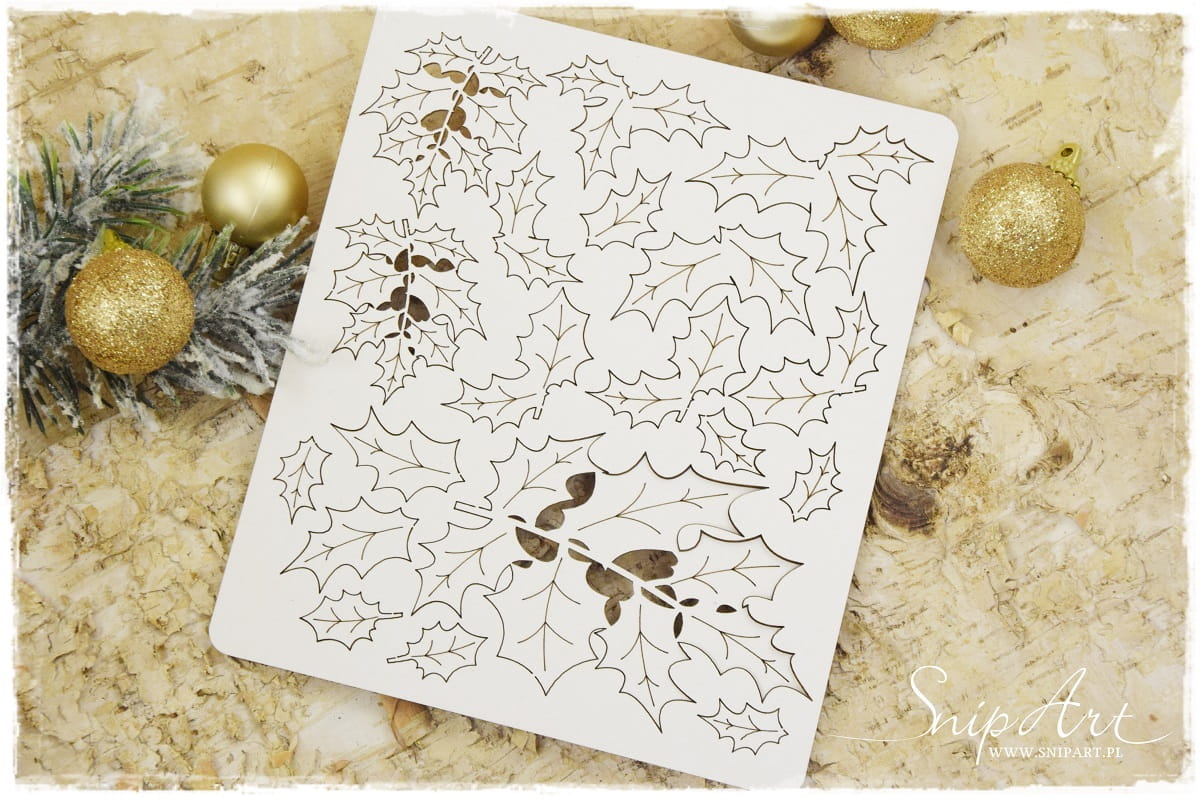 Ostrokrzew - 19 różnych listków. Wycinanka z tektury beermaty o grubości 1,5mm Wymiary arkusza - ok. 138mm x 160mm.