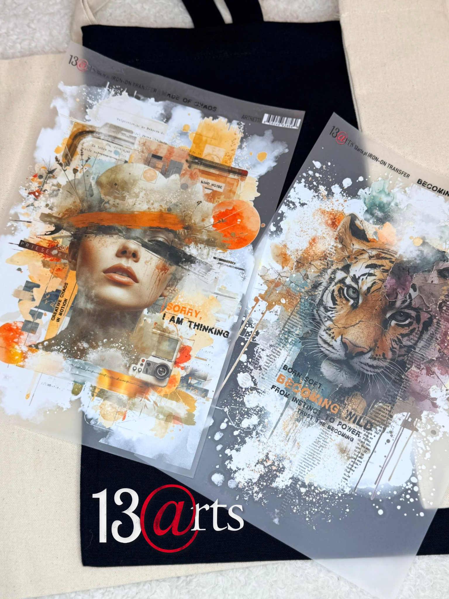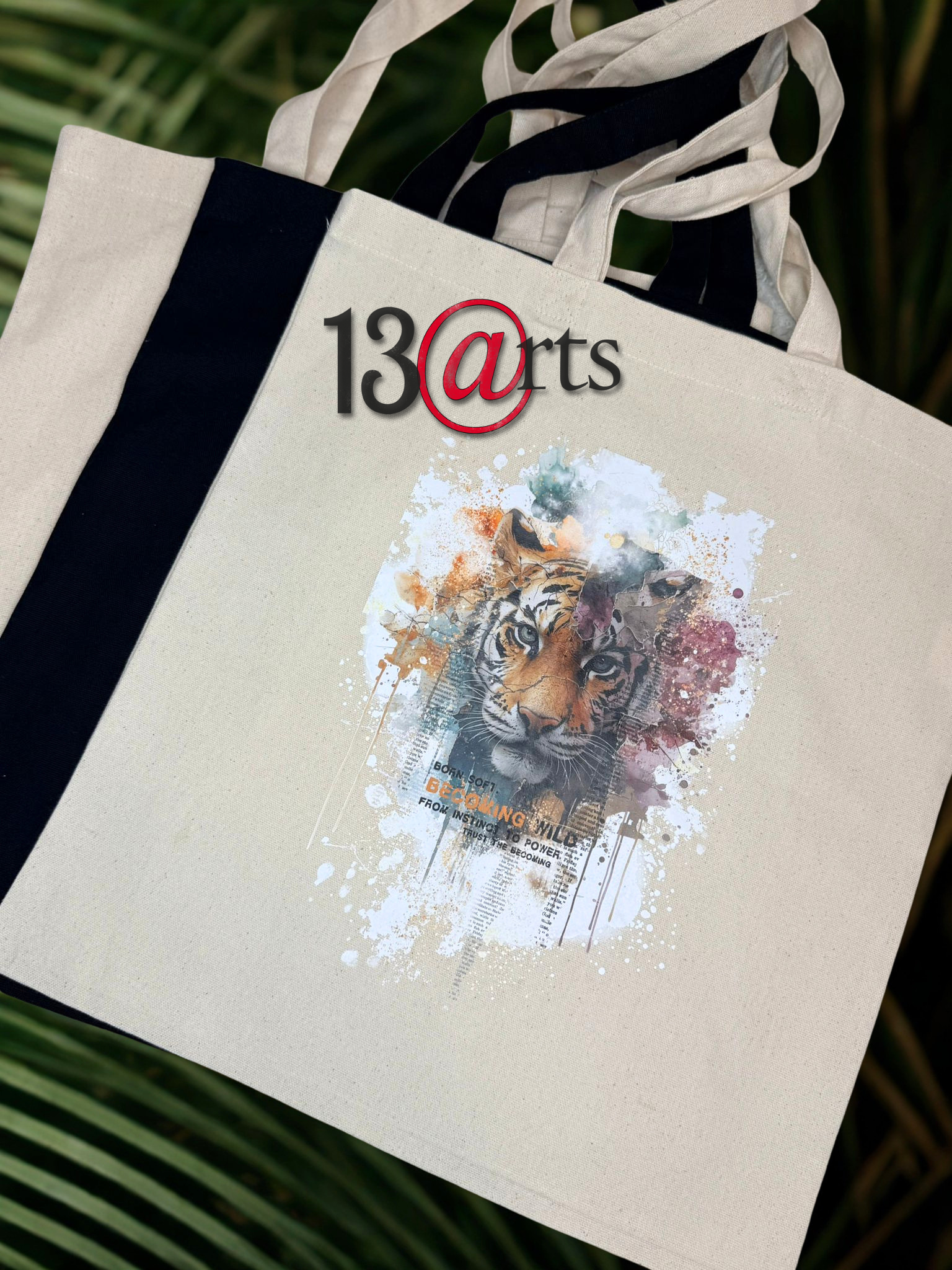 * Becoming Wild (Tygrys): Silny, ekspresyjny portret tygrysa otoczony plamami farby i typografią. Symbol siły, instynktu i niezależności. Hasło "Born soft, from instinct to power" dodaje mu motywacyjnego charakteru.